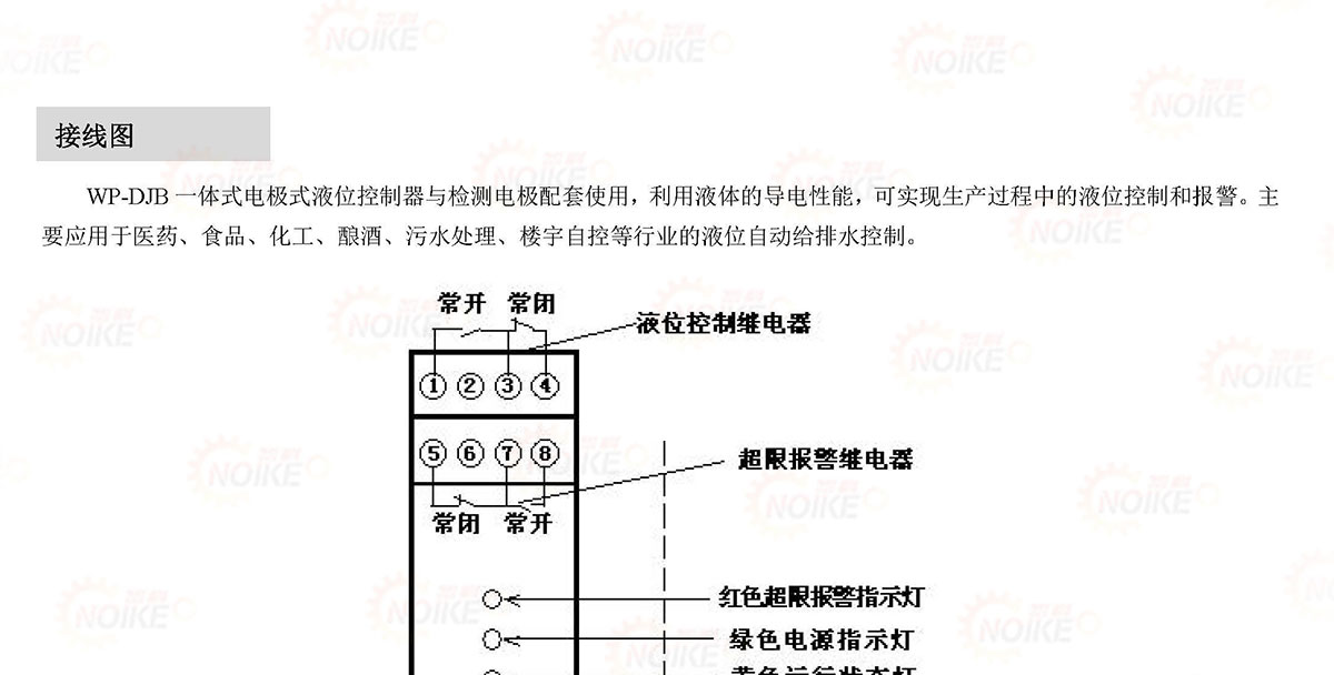 WP-DJC分體電極式液位控制器與檢測電極配套使用,利用液體的導(dǎo)電性能,可實(shí)現(xiàn)生產(chǎn)過程中的液位控制和報(bào)警。主要應(yīng)用于醫(yī)藥、食品、化工、釀酒、污水處理、樓宇自控等行業(yè)的液位自動給排水控制。