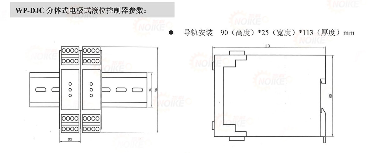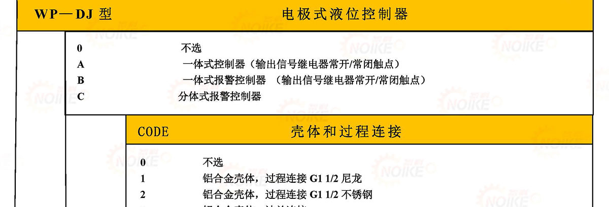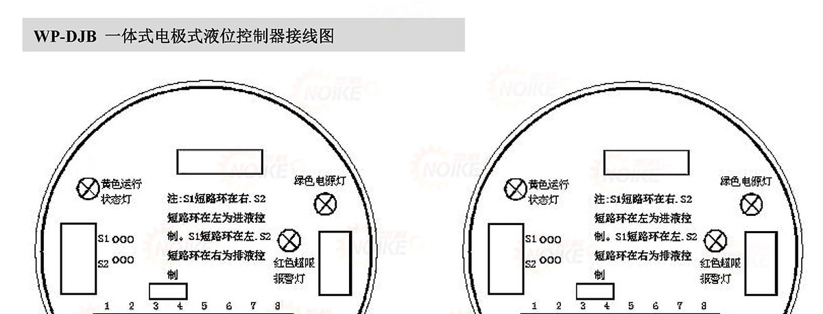 WP-DJ型電極液位控制器由液位檢測電極和控制器兩部分組成,它與機(jī)泵結(jié)合可以實(shí)現(xiàn)水池或罐體進(jìn)液、排液控制WP-DJ型電極液位控制器分一體型和分體型兩種安裝形式。一體型電極液位控制器是將控制器的電路板裝入液位檢測電極的接線盒內(nèi),組成一體結(jié)構(gòu);分體型是控制器與檢測電極分開安裝,控制器精巧緊湊,有控制箱內(nèi)軌道安裝和控制盤面板安裝兩種形式。針對不同的使用環(huán)境,液位檢測電極又可分為塑料殼體和鋁合金防爆殼體,與設(shè)備連接有尼龍連接件和不銹鋼連接件兩種,可根據(jù)實(shí)際工況選擇。