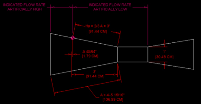 下圖顯示了從喉嚨向后測(cè)量與沿側(cè)壁進(jìn)行測(cè)量之間的差異。對(duì)于12英寸的Parshall槽(如圖所示),兩次測(cè)量的45/64英寸之間存在差異。